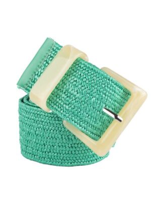 Стильный ремень-резинка мятного цвета из текстиля с пряжкой, имтирующей слоновую кость. Плетеная структура ремня позволяет застегнуть его в любом удобном месте, что в значительной степени увеличивает его практичность при ношении и позволяет отрегулировать для себя комфортный размер. Модель отлично сочетается с нейтральными рубашками, пиджаками, джинсами и брюками, разнообразит любой образ, не перегружая его.