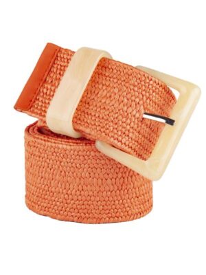 Стильный ярко-оранжевый ремень-резинка из текстиля с пряжкой, имтирующей слоновую кость. Плетеная структура ремня позволяет застегнуть его в любом удобном месте, что в значительной степени увеличивает его практичность при ношении и позволяет отрегулировать для себя комфортный размер. Модель отлично сочетается с нейтральными рубашками, пиджаками, джинсами и брюками, разнообразит любой образ, не перегружая его.