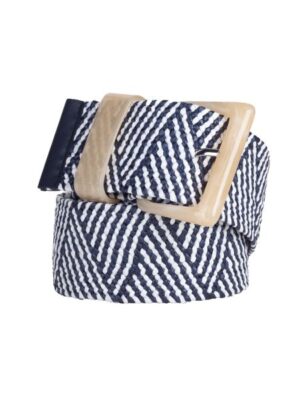 Стильный сине-белый контрастный ремень-резинка из текстиля с пряжкой, имтирующей слоновую кость. Плетеная структура ремня позволяет застегнуть его в любом удобном месте, что в значительной степени увеличивает его практичность при ношении и позволяет отрегулировать для себя комфортный размер. Модель отлично сочетается с нейтральными рубашками, пиджаками, джинсами и брюками, разнообразит любой образ, не перегружая его.