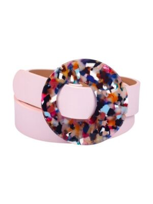 Стильный аксессуар розового цвета из эко кожи с ассиметричной разноцветной пряжкой. Цвета застежки станут отличным стилистическим решением при выборе цветовой палитры, чтобы сделать образ законченным и гармоничным. Щелевая пряжка позволяет легко отрегулировать размер под любую фигуру.