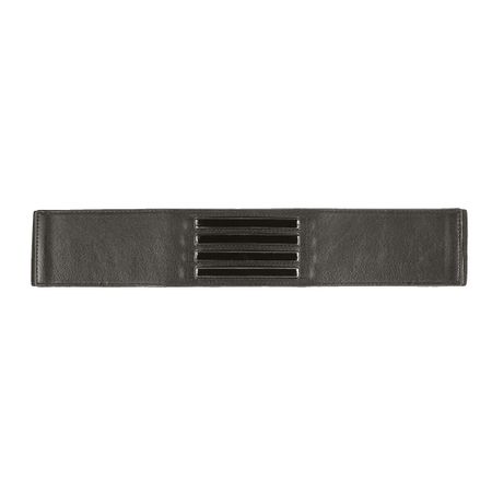 Широкий черный текстильный ремень — замечательный аксессуар, чтобы поставить новые акценты в привычном образе. Особый шик ему придают горизонтальные вставки из лаковой искусственной кожи.