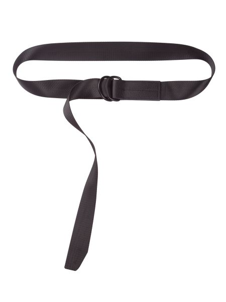 Актуальный повседневный текстильный ремень — стропа черного цвета с кольцевой черной пряжкой для регулирования размера. Декоративное плетение в технике саржевой киперной ленты. Ремень со свободно свисающими концами создает дополнительную вертикаль, которая вытягивает силуэт, плотная посадка акцентирует талию.