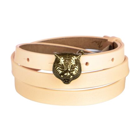 Главная » Аксессуары Ремень Просмотров 4 Яркий, тонкий ремень из натуральной кожи. Бежевого оттенка. Пряжка в виду головы леопарда оттенка состаренного золота. Имеется кожаная шлейка. Модные истории
