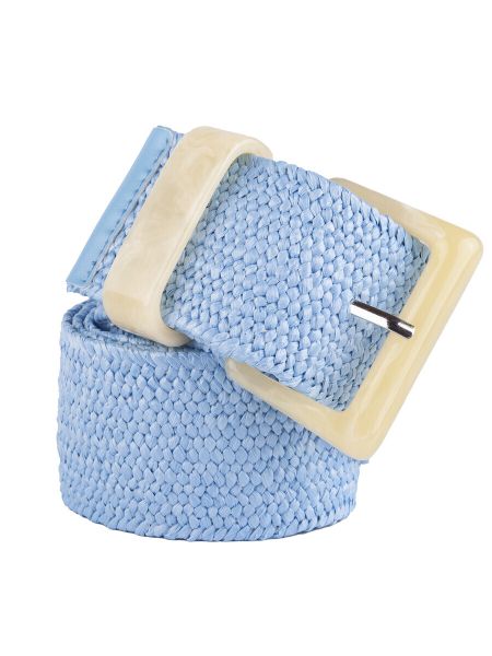 Стильный ремень-резинка голубого цвета из текстиля с пряжкой, имтирующей слоновую кость. Плетеная структура ремня позволяет застегнуть его в любом удобном месте, что в значительной степени увеличивает его практичность при ношении и позволяет отрегулировать для себя комфортный размер. Модель отлично сочетается с нейтральными рубашками, пиджаками, джинсами и брюками, разнообразит любой образ, не перегружая его.