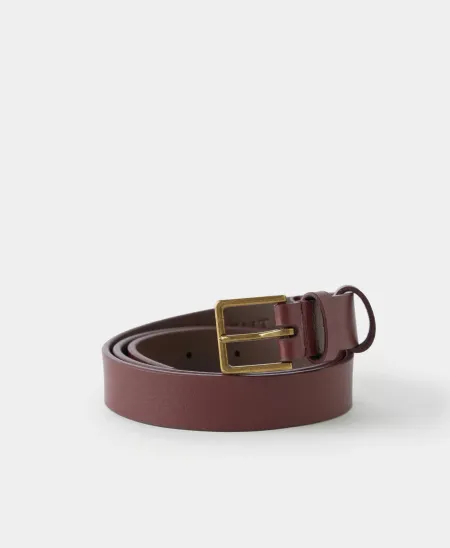 Ремень средней ширины выполнен из натуральной кожи с естественной фактурой и дополнен квадратной пряжкой в винтажном стиле с эффектом состаренного золота. Ремень представлен в черном, бордовом и орехо