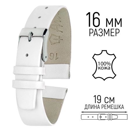 Кожаный ремешок — является неотъемлемой частью наручных часов. Это важный аксессуар в имидже каждого человека. Он придает наручным часам изысканный внешний вид и стиль. Подойдет как для классических механических, так и умных смарт-часов. Если корпус часов может служить долгие годы, то ремешок часто изнашивается намного раньше, поэтому, если вы не хотите испортить свой имидж, позаботьтесь о его замене заранее.Женский ремешок для часов – это стильный и элегантный аксессуар, который подойдет как девушкам, так и женщинам. Изготовлен из натуральной кожи, что гарантирует длительный срок службы и хорошую устойчивость к износу. Подкладка – кожа теленка растительного дубления. В ремешке можно сделать дополнительные отверстия для удобства ношения часов. Сделано в Беларуси.Особенности:Размер: 16 ммЦвет: белыйОписание: непрошитый без наполнителя, край полурембортДлина запряжника: 75 ммДлина горта: 115 ммПряжка выполнена из прочного металла, гарантируя надежную фиксацию на запястье. Без шпилек для крепления. Кожаный ремень – является идеальным выбором для тех, кто ценит натуральные материалы и высокое качество. Имеет универсальное назначение и подходит для женских часов. Этот браслет для часов станет прекрасным подарком для девушки, коллеги, подруги, мамы или сестры.При выборе браслета следует учитывать два важных параметра:Ширина ремешка. Все браслеты и часы совместимы исключительно по ширине. Внимательно измерьте расстояние между ушками на часах и подберите подходящий вариант.Длина ремешка для часов. Измерьте своё запястье. Выбирайте браслет чуть больших размеров, чтобы не чувствовать дискомфорт при ношении этого наручного аксессуара.