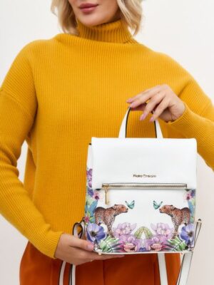 <div>Рюкзак женский с ручкой на двух регулируемых лямках из натуральной зерненой кожи, закрывается на клапан и магнитные кнопки. В городском стиле, мягкий, легкий, функциональный. На передней стенке нежный летний принт. Подходит для повседневной носки, учебы, прогулок, в качестве подарка. Внутри одно отделение, один карман на молнии, один открытый карман. В клапане большой карман на молнии, сзади карман на молнии. На дне есть металлические ножки. Вес рюкзака 650 грамм, в упаковке 700 грамм. Производство Россия. Состав: натуральная кожа. Высота -31 см. Длина — 26 см. Глубина -12 см</div>