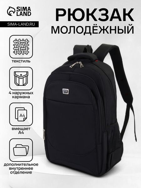 Рюкзак молодёжный из текстиля, 2 отдела на молнии, 4 кармана, цвет чёрный