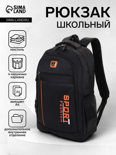 Рюкзак школьный на молнии, с карманами, чёрный/оранжевый