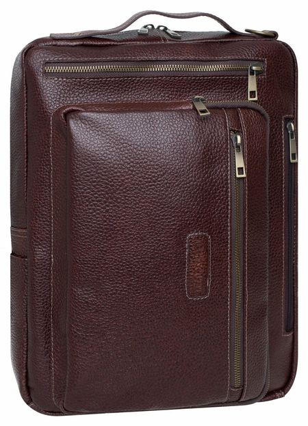 Рюкзак-сумка с одним отделением на молнии. Внутри отделение для ноутбука на липучке, потайной карман на молнии и два открытых кармана. Снаружи спереди объемный карман на молнии с врезным карманом и еще один врезной карман на молнии на корпусе сумки. Имеется ручка для переноски сумки в вертикальном положении и две ручки, которые находятся в карманах под молнией, для использования изделия как большую мужскую сумку. Также есть два отстегивающихся регулируемых ремня(115см) на карабинах для ношения рюкзака или сумки на одном ремне.Материал: Натуральная кожа , Размер: 380x280x130
