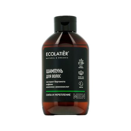Шампунь Сила и укрепление ECOLATIER® MEN эффективно и бережно очищает волосы и кожу головы. Способствует укреплению волосяных луковиц, предотвращает ломкость и выпадение. Нормализует гидролипидный баланс кожи головы, делает волосы более сильными и густыми, ухаживает за ними и защищает от воздействия негативных факторов окружающей среды.br /Подходит для всех типов волос.br /Содержит более 98% ингредиентов натурального происхождения.br /Экстракт бергамота снижает ломкость волос и препятствует их истончению.br /Масло кипариса нормализует работу сальных желез, стимулирует активную регенерацию клеток.br /Кофеин оказывает тонизирующее и укрепляющее действие, стимулирует кровообращение и способствует росту волос.br /Комплекс аминокислот и витамин В3 активизируют обменные процессы в волосяных луковицах, усиливают структуру волос.