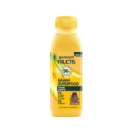 Шампунь Fructis Superfood Бананbr /br /Бережное очищение и интенсивное питание волос одновременно — возможно! Представляем шампунь Fructis Superfood* Банан, разработанный специально для очень сухих волос. Шампунь содержит 96% натуральных ингредиентов, формула средства усилена пользой банана и ухаживающими компонентами. Попробуй и наслаждайся результатом: волосы мягкие, шелковистые и сияющие красотой!br /br /Почувствуй силу природных компонентов и будь готова к преображению волос вместе с шампунем Fructis Suerfood* Банан:br /br /- Формула с бананом: обеспечивает интенсивное питание и увлажнение без эффекта утяжеления.br /- Легкая текстура: превращается в нежную воздушную пену, деликатно очищает волосы и кожу головы.br /- Подходит для ежедневного применения и поддержания красоты волос.br /- Фруктовый аромат: делает домашний уход за волосами еще приятнее и поднимает настроение.br /- Без силиконов.br /br /Шампунь Fructis Superfood* Банан — отличное решение для сухих волос, которые выглядят тусклыми и безжизненными. Активные компоненты средства обеспечат качественное питание и уход, сделают волосы мягкими, шелковистыми и блестящими!br /br /Для достижения оптимального результата используй шампунь для волос женский в комплексе с мультифункциональной маской Fructis Superfood* Банан. Способ применения:br /br /- Шампунь очистит волосы и кожу головы, подготовит их к нанесению других уходовых продуктов.br /- Маска для волос обеспечит интенсивное питание, сделает волосы более блестящими и послушными, облегчит расчесывание.br /Попробуй прямо сейчас и почувствуй, как твои волосы преображаются с каждым разом! Ощути разницу вместе с уходовыми средствами для волос Fructis Superfood* Банан!br /*Superfood — художественное сравнение, не является продуктом питания.
