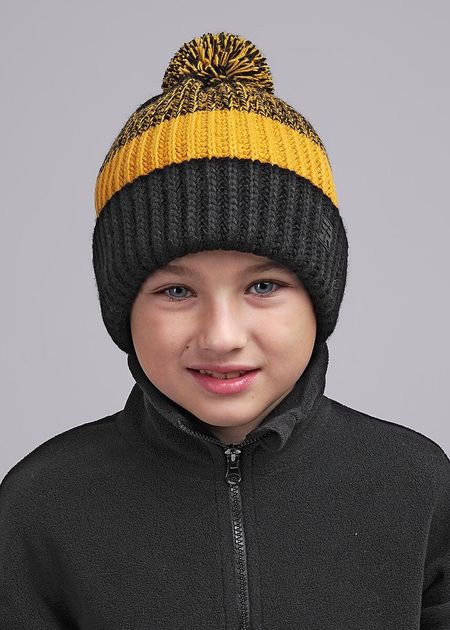 Детская шапка с отворотом и помпоном из акриловой пряжи. Модель утеплена флисом по всей голове, поэтому она идеально подойдет для холодной зимы. Шапка декорирована нашивкой логотипом на отвороте. Вязаная шапка послужит отличной защитой от холода и ветра.<br> Рекомендуется стирать в режиме деликатной стирки при температуре 30 градусов.