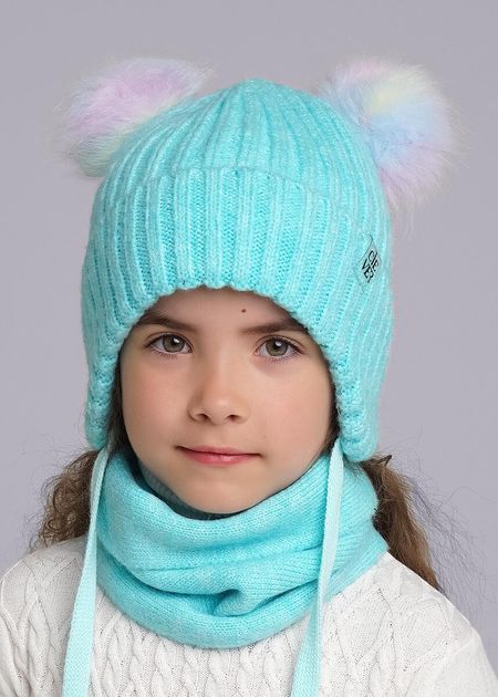 Детская шапка с отворотом из акриловой пряжи. Шапка отлично сохраняет тепло за счет флисового утепления и завязок. Детская шапка декорирована игривыми помпонами. Шапка отлично подойдет для холодной зимы и составит оригинальный образ с пуховиками и шубками.<br> Рекомендуется стирать в режиме "Деликатная стирка" при температуре 30 градусов.