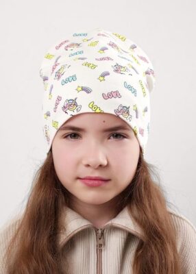 Детская двойная шапка без отворота с принтом для девочки. Выполнена из эластичного хлопкового полотна рибана. Отлично подойдет для теплой весны и прохладного лета. Рекомендуемая температура стирки — до 40 градусов, температура утюжки — до 140 градусов.
