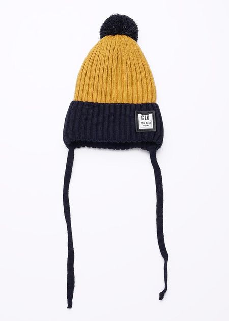 Детская шапка с отворотом на завязках выполнена из акриловой пряжи (искусственная шерсть) и утеплена флисом и синтепоном по всей голове. Модель декорирована стильной нашивкой в височной зоне и ниточным помпоном. Теплая шапка идеально подойдет для холодной зимы.<br> Рекомендуется стирать в режиме деликатной стирки при температуре до 30 градусов.