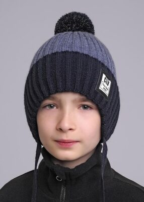 Детская шапка с отворотом на завязках выполнена из акриловой пряжи (искусственная шерсть) и утеплена флисом и синтепоном по всей голове. Модель декорирована стильной нашивкой в височной зоне и ниточным помпоном. Теплая шапка идеально подойдет для холодной зимы.<br> Рекомендуется стирать в режиме деликатной стирки при температуре до 30 градусов.