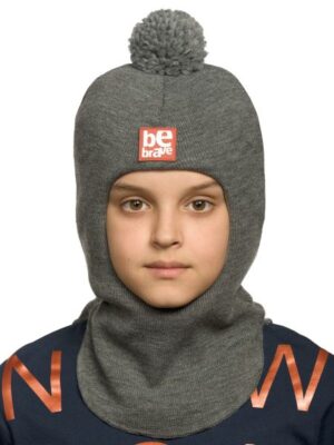 Зимняя шапка шлем для мальчиков, зона ушей и лба утеплена синтепоном, который закреплен на хлопковом подкладе, отсутствует отстрочка вокруг лица, максимальное прилегание по плечам и шее за счет боковых швов и эластичной обработки по низу изделия. Декорирована помпоном из ниток и резиновой нашивкой с надписью Будь смелым.