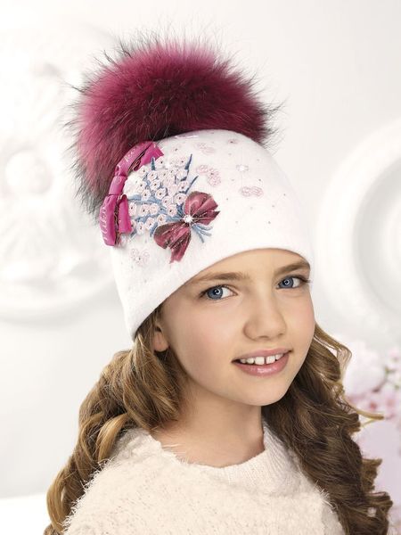 Шапка шерстяная с подкладкой из флиса. Флисовая подкладка делает изделие комфортным в носке. Украшена яркой аппликацией в виде букета нежных цветов. Дополняют композицию бант и россыпь страз. Помпон съемный из натурального меха.
