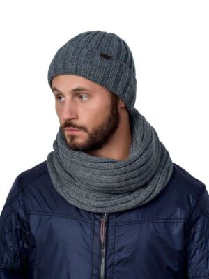 Мужской комплект 2-ка из полушерстяной пряжи. Теплая шапка по голове с отворотом. Флисовая подкладка делает изделие комфортным в носке. Сбоку шапка украшена фирменной кожаной шильдой. В ПРОДАЖЕ ВМЕСТО СНУДА — ШАРФ размером 20х165 см.