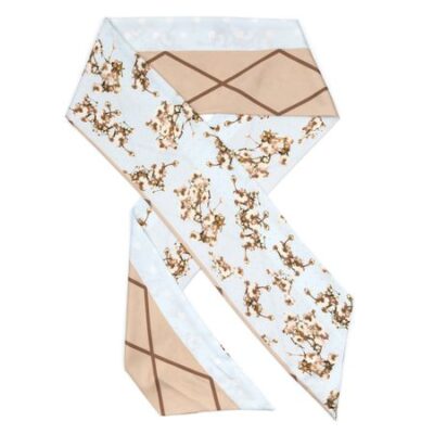 Романтичный шарф твилли с нежной струящейся фактурой шелка непременно оценит любая модница! Шарф выделяется сочетанием двух принтов: женственного флорального и геометрической классики, гармонирующих между собой по цвету. Созданный в таком миксе небесно-голубого оттенка и цвета "Кофе с молоком", аксессуар несомненно привлекает внимание и придает образу мечтательности и женственности. Ширина твилли позволяет носить его не только как платок, но также как аксессуар для волос, головных уборов или пояс. Рекомендации по уходу: ручная стирка/химчистка.