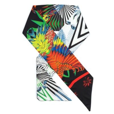 Яркий и красочный шарф твилли выполнен с добавлением в полотно шелковой нити, благодаря чему приобрел характерную гладкость и блеск. Аксессуар моментально оживит и украсит любой образ за счет тропического принта с элементами анималистических и флоральных узоров по черно-белому полю. Ширина шарфика позволяет носить его не только как платок, но также как аксессуар для волос, головных уборов или пояс. Рекомендации по уходу: ручная стирка/химчистка.