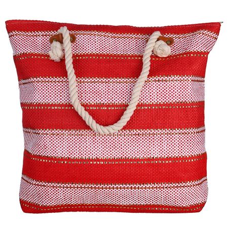 Текстильная пляжная сумка в красно-белую полоску с длинными ручками — канатами выполненна в стиле морской тематики изготовлена из целлюлозы. Сумка очень вместительна, внутри — одно отделение и один небольшой карман, застежка — молния. Длинные ручки позволят носить ее на плече. Размер: 41 * 47 см.