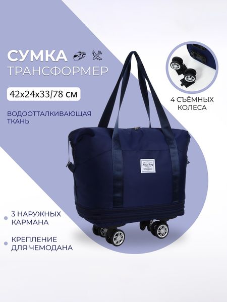 Дорожная сумка на съемных колесах, выполнена в стильном синем цвете, станет вашим незаменимым спутником в дороге. Ее компактный размер (42x33x24 см) скрывает удивительную вместительность. Унисекс дизайн из прочного полиэстера обеспечивает надежность и долговечность, а удобный отдел на молнии позволяет организовать вещи в полном порядке. При необходимости смело увеличивайте объем – сумка приспособлена расширяться для удобного размещения всех необходимых вещей. Идеальный выбор для активных путешественников.Преимущества Маневренность: четыре пластмассовых колеса обеспечивают легкое и плавное перемещение. Универсальность: подходит для путешествий, командировок и повседневной жизни. Эргономика: удобная ручка и держатель для чемодана делают использование сумки максимально комфортным. Долговечность: износостойкий полиэстер защищает вещи от влаги и пыли, гарантируя длительный срок службы. Дополнительные карманы: три наружных кармана подходят для хранения мелочей, необходимых в дороге. Легкость: небольшой вес придает простоту в транспортировке. Стиль: однотонный синий цвет добавляет нотку элегантности и подходит для любого случая.Позвольте себе свободу передвижения и уверенность в каждой детали вашего путешествия. Дорожная сумка на колесах предлагает практичность и стиль без лишних затрат. Ваши вещи будут в безопасности, а вы — спокойны. Выбирайте удобство и надежность в одной модели.