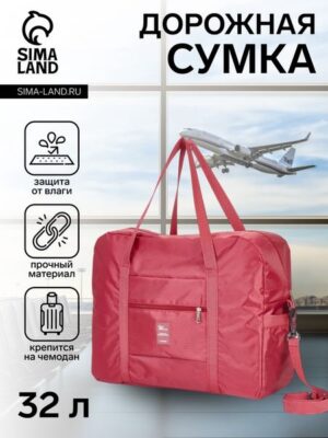 Сумка дорожная на молнии, 3 наружных кармана, держатель для чемодана, длинный ремень, бордовая