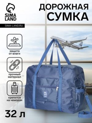 Сумка дорожная на молнии, 3 наружных кармана, держатель для чемодана, длинный ремень, синяя