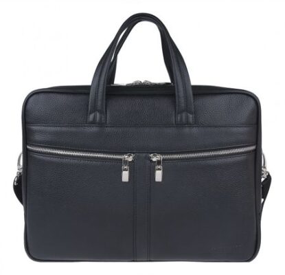 Сумка имеет два отдельных отделения на молнии. В одном отделении прорезной карман на молнии и карман на липучке для ноутбука. В другом два открытых кармана. Спереди два кармана на молнии и сзади карман на молнии. Две ручки и регулируемый плечевой ремень(135см). Материал: Натуральная кожа Леванта. Эластичная, особопрочная натуральная кожа, отделанная по европейским технологиям, Размер: 365x285x85