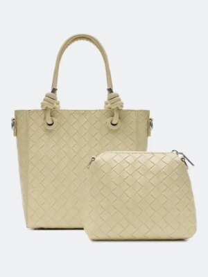 Сумка с имитацией плетения. Две короткие ручки. Длинный регулируемый плечевой ремень в комплекте. Косметичка в комплекте. Застежка кнопка. Застежка косметички молния. Состав: искусственная кожа