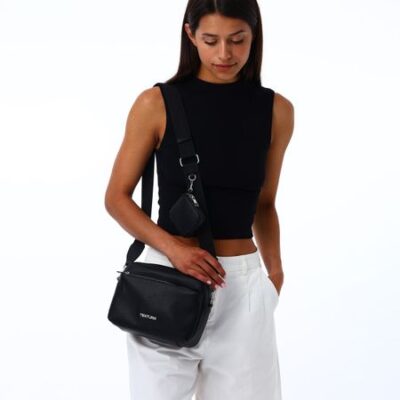 Сумка женская на молнии TEXTURA, маленький размер, цвет черный. Эта изящная и стильная женская сумка через плечо от TEXTURA — идеальный аксессуар для современной женщины, ценящей элегантность и функциональность. Благодаря компактным размерам (16 см x 7 см x 17 см), она легко впишется в любой образ, обеспечивая при этом удобство ношения и организованное хранение необходимых вещей. Сумка выполнена из высококачественной искусственной кожи, которая не только внешне напоминает натуральный материал, но и отличается повышенной долговечностью и простотой в уходе. Ее полукаркасная конструкция надежно защищает содержимое, а серебристая фурнитура придает аксессуару утонченный акцент. <ul> <li> <strong> Функциональность:</strong> два внешних кармана и основной отсек на молнии обеспечивают удобный доступ к вашим вещам, позволяя быстро находить нужное.</li> <li> <strong> Комфорт в использовании:</strong> регулируемый длинный ремешок дает возможность носить сумку как через плечо, так и на плече, подстраиваясь под ваш стиль и предпочтения.</li> <li> <strong> Универсальность:</strong> классический черный цвет и минималистичный дизайн делают сумку подходящей для любого случая — от деловых встреч до вечерних прогулок.</li> <li> <strong> Легкость и компактность:</strong> вес сумки всего 310 г, что делает ее идеальной для тех, кто ценит свободу движений и не хочет быть обремененным тяжелыми аксессуарами.</li> </ul> Сумка от TEXTURA — это не просто модный аксессуар, а ваше идеальное решение для повседневного использования, объединяющее стиль, качество и практичность.