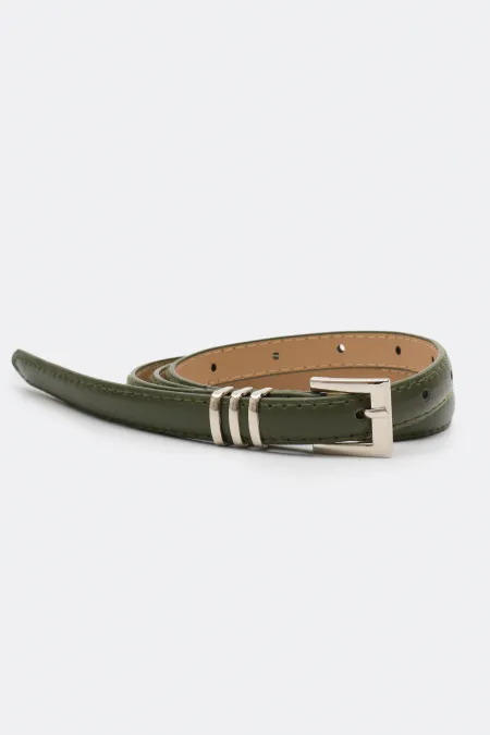 Узкий ремень с металлическими шлевками. Искусственная кожа. Прямоугольная пряжка. Состав: искусственная кожа
