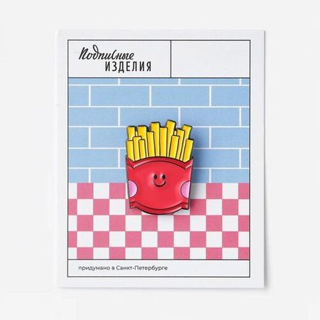 Размер упаковки: 55х68Размер без упаковки: 20х22,3 ммМатериал: сплав цинка/никеля с покрытием эмалиМеханизм крепления: бабочкаСерия: ЕдаСтрана производитель: Китай