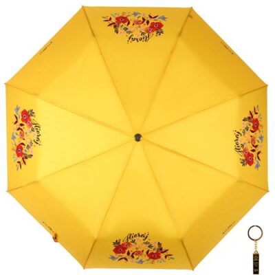 Дизайнерский женский зонт от бренда «Flioraj» (Флиораж). Система Антиветер. Полный автомат (супер автомат) в 3 сложения. Открывается и закрывается посредством кнопки, фиксируется вручную. Большой купол из качественного эпонжа с пропиткой от влаги и грязи. Усиленный каркас: алюминий, анодированная сталь, фибергласс. Эргономичная пластиковая «Soft Touch» ручка с хлястиком. Фурнитура с винтажной позолотой, которой инкрустированы элементы зонта. Есть Чехол, брелок в виде золотого слитка. Авторская застежка.