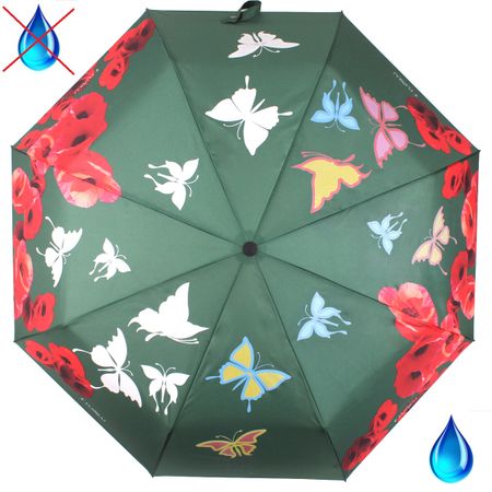 Элегантный женский зонт от российского бренда «Flioraj» (Флиораж), премиальная авторская коллекция. Полный автомат, 3 (три) сложения. Материал купола — качественный полиэстер с пропиткой от влаги и грязи. Картина "Волшебная Иллюзия" — на зеленом зонте принт "красные цветы" и белые бабочки, которые меняют цвет от попадания воды Ткань мягкая на ощупь, из переплетенных нитей. Гибкие 8 (восемь) спиц сделаны из фибергласса с карбоновыми вставками. Особенность: наличие пружин в каждой спице, это увеличивает прочность и срок эксплуатации. Антиветер (система, не позволяет зонту сломаться при ветре). Зонт для женщин, повышенной надежности. Большой купол 116 см (по спице). Эргономичная прорезиненная ручка "Soft Touch" с хлястиком. Усиленный каркас: алюминий, анодированная сталь, фибергласс. Заклепки из нержавеющей стали. Зонт легко помещается в дамской [сумочке]. Имеется тематический [чехол]. Перед закрытием зонт необходимо тщательно высушить в открытом виде! Оригинальный подарок для женщин.
