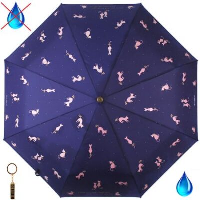 Дизайнерский женский зонт от бренда «Flioraj» с проявляющимся от воды рисунком (проявляется одна половина рисунка). Система «Антиветер». Полный автомат (супер автомат) в 3 сложения. Открывается и закрывается посредством кнопки, фиксируется вручную. Большой купол из качественного эпонжа с пропиткой от влаги и грязи. Ткань красится ручным способом. Усиленный каркас: алюминий, анодированная сталь, фибергласс. Эргономичная пластиковая ручка с хлястиком. Фурнитура с винтажной позолотой, которой инкрустированы элементы зонта. Есть Чехол и брелок в виде золотого слитка. Авторская застежка.