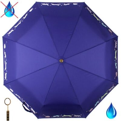 Дизайнерский женский зонт от бренда «Flioraj» с проявляющимся от воды рисунком (проявляется одна половина рисунка). Система «Антиветер». Полный автомат (супер автомат) в 3 сложения. Открывается и закрывается посредством кнопки, фиксируется вручную. Большой купол из качественного эпонжа с пропиткой от влаги и грязи. Ткань красится ручным способом. Усиленный каркас: алюминий, анодированная сталь, фибергласс. Эргономичная пластиковая ручка с хлястиком. Фурнитура с винтажной позолотой, которой инкрустированы элементы зонта. Есть Чехол и брелок в виде золотого слитка. Авторская застежка.