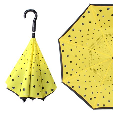Элегантный женский реверсивный зонт-трость от бренда «Flioraj» (Флиораж). Двойной увеличенный купол. Верх черный, низ желтый в горошек. Система «Антиветер». Усиленный каркас: карбон, фибергласс. Умный зонт «наоборот» складывается внутренней (сухой) стороной наружу. Купол из качественного эпонж, с пропиткой от влаги и грязи. Эргономичная прорезиненная ручка «Soft Touch».