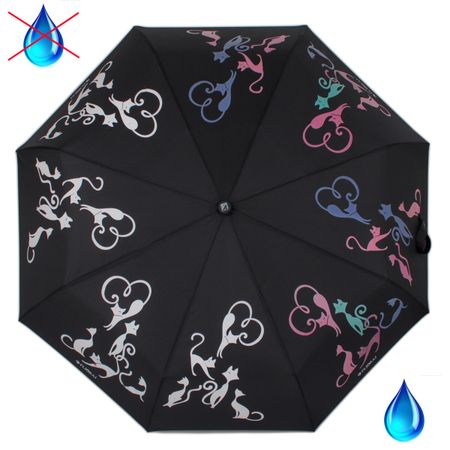 Элегантный женский зонт от российского бренда «Flioraj» (Флиораж), премиальная авторская коллекция. Полный автомат, 3 (три) сложения. Материал купола — качественный эпонж с пропиткой от влаги и грязи. Картина "Богиня Кошка" — на черном однотонном зонте белые кошки, меняющий цвет от попадания воды. Ткань мягкая на ощупь, из переплетенных нитей. Гибкие 8 (восемь) спиц сделаны из фибергласса с карбоновыми вставками. Особенность: наличие пружин в каждой спице, это увеличивает прочность и срок эксплуатации. Антиветер (система, не позволяет зонту сломаться при ветре). Зонт для женщин, повышенной надежности. Большой купол 116 см (по спице). Эргономичная прорезиненная ручка "Soft Touch" с хлястиком. Усиленный каркас: алюминий, анодированная сталь, фибергласс. Заклепки из нержавеющей стали. Зонт легко помещается в дамской [сумочке]. Имеется тематический [чехол]. Перед закрытием зонт необходимо тщательно высушить в открытом виде! Оригинальный подарок для женщин.