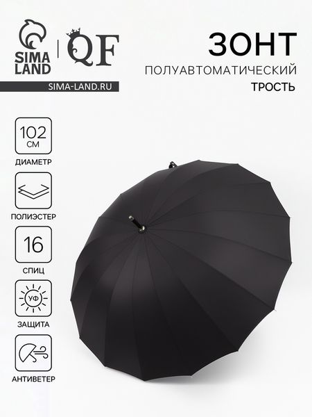 Зонт — трость полуавтоматический «Однотон», 16 спиц, R=51/60 см, d=102 см, чёрный