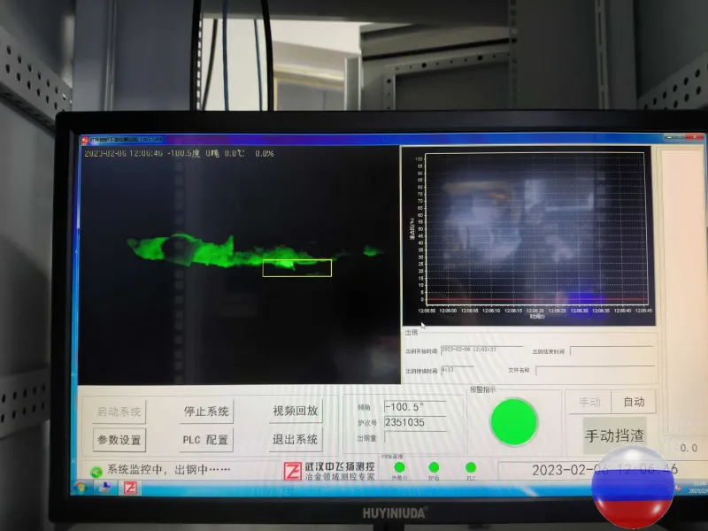 Эффективность обнаружения шлака в конвертере имеет решающее значение для контроля выпуска шлака. Разработанная нашей компанией система обнаружения и контроля конвертерного шлака использует тепловизор дальнего инфракрасного диапазона для бесконтактного мониторинга струи стали, детектируя шлак в режиме реального времени и генерируя сигналы тревоги и управляя системами. Это заменяет ручной визуальный контроль, обеспечивая точное, эффективное и стабильное обнаружение шлака. При обнаружении шлака интеллектуальный блок управления быстро определяет необходимость подъема печи для предотвращения его образования и выдает сигнал тревоги.