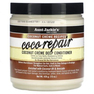 Описание Кудри и катушкиРецепты кокосового кремаБез сульфатов / без парабенов / без минерального масла / без вазелинаОбеспечивает питание стержня волос, предотвращая их повреждение и ломкостьДля естественных локонов, завитков и волнОбогащен кокосовым маслом и авокадоНесравненный ремонт! В кондиционирующем уходе тети Джеки кокос, авокадо, манго и семена льна помогают восстановить поврежденные волосы, остановить ломкость, смягчить, придать блеск и увлажнить сухие ломкие волосы.Рецепт кокосового крема от тети Джеки CocoRepair на основе масел-носителей, которые впитывают питательные вещества в стержень волос, помогает улучшить внешний вид и ощущение хронически сухих ломких локонов. CocoRepair — эффективное средство, которое поможет вернуть волосам яркое и мягкое состояние, будь то хроническая сухость, чрезмерная обработка химическими выпрямителями или окрашивание, укладка горячей укладкой, плетение косичек или определенные условия окружающей среды. Особенно хорошо подходит для текстур 2c-4c. Этот продукт не содержит вазелина или минеральных масел, которые не утяжеляют волосы. Рекомендации по применению На чистые влажные волосы нанесите обильное количество средства на все волосы, убедившись, что волосы покрыты от корней до кончиков. В качестве интенсивного восстанавливающего средства накройте волосы пластиковым колпачком и подержите 10 минут под теплым феном. Снимите банку с волос и смойте все следы маски. В качестве обычного кондиционера оставьте на 5 минут, а затем тщательно смойте. Промокните волосы полотенцем и уложите как обычно. Для достижения оптимальных результатов сначала используйте шампунь с кондиционером CoCoWash от тети Джеки, а затем нанесите несмываемое средство от тети Джеки. Мы рекомендуем использовать интенсивный увлажняющий герметик Butter Crème. Ингредиенты Вода, цетеариловый спирт, кокосовое масло (Cocos nucifera), глицерин, глицерил стеарат, масло из семян льна (Linum usitatissimum), стеарамидопропил диметиламин, алкан c9-12, оливковое масло (Olea europaea), масло ши (Butyrospermum parkii), диметикон, отдушка, бегентримония метосульфат, феноксиэтанол, масло авокадо (Persea gratissima), поликватерниум-37, пропиленгликоль дикаприлат/дикапрат, масло из косточек манго (Mangifera indica), цетеарет-20, амодиметикон, лимонная кислота, мед, масло из косточек арганы (Argania spinosa), акриламидопропилтримониум хлорид/акриламид сополимер, этилгексилглицерин, ППГ-1 тридецет-6, гидролизованный кератин, гидролизованный растительный белок ПГ-пропил силантриол, токоферол, сорбат калия, двунатриевая ЭДТК, кумарин, лимонен. Предупреждения Хранить в недоступном для детей месте. Волосы могут вызвать ожоги. Беречь волосы от искр, открытого огня и высоких температур. Избегать попадания в глаза. При попадании в глаза тщательно промойте их водой. Только для наружного применения.