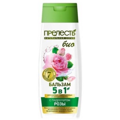 Бальзам для волос Прелесть Био Эксперт 5 в 1 для всех типов волос с гидрола том розы. Средство для волос с комплексом на основе 7 целебных трав (крапива, ромашка, розмарин, шалфей, хвощ, хмель, мелисса) эффективно восстанавливает ломкие, сухие, окрашенные, поврежденные волосы и поддерживает состояние нормальных волос. Бальзам после шампуня для волос Прелесть Био дополнительно питает, укрепляет структуру и увлажняет волосы по всей длине, предотвращая ломкость и секущиеся кончики. Розовая вода издавна считается полезной для кожи и волос, гидролат розы увлажняет сухие волосы, поддерживает водный баланс в структуре волоса. Способствует росту, сохранению длины, обеспечивает легкое расчесывание.