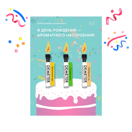 Ароматное дополнение к подарку. К яркой открытке приложены 3 мини-флакончика 1,5 мл с праздничными ароматами. — Такая открытка запомнится. Её хочется положить на видное место как воспоминание о лучшем дне в году. — Это не просто подарок. Ароматы — демонстрация вашего отношения к близкому. — Открытку удобно носить с собой, чтобы флакончики не потерялись. — Ароматы на открытке можно смешивать, чтобы создать свою композицию под настроение.