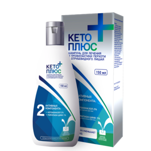Показания к применениюЛечение и профилактика поражений кожи и волосистой части головы, вызванных дрожжеподобными микроорганизмами Malassezia furfur (Pityrosporum ovale), включая: отрубевидный лишай; себорейный дерматит волосистой части головы и различные виды перхоти.Применение при беременности и кормлении грудьюПоскольку при местном применении компоненты препарата практически не всасываются, использование шампуня во время беременности и периода грудного вскармливания не противопоказано.ПротивопоказанияПовышенная чувствительность к любому из компонентов.Побочное действиеКето плюс обычно хорошо переносится. Как и при использовании других шампуней возможно местное раздражение, зуд, повышенная жирность или сухость волос и/или усиленное выпадение волос. Обычно при использовании шампуня Кето плюс такие явления отмечаются редко. В отдельных случаях, в основном у пациентов с химически поврежденными или седыми волосами, отмечалось изменение цвета волос.Состав1 г шампуня содержит: активные вещества: кетоконазол 20 мг цинк пиритион 10 мг вспомогательные вещества: основа шампуня Велко SX200 (этиленгликоля моностеарат, этиленгликоля дистеарат, натрия лаурилсульфат, диэтаноламид кокосового масла жирных кислот и моноэтаноламид кокосового масла жирных кислот); пропиленгликоль; гипромеллоза; кремния диоксид коллоидный; имидомочевина; магния алюмосиликат; краситель азорубин; хлористоводородная кислота концентрированная; ароматизатор «Швейцарский букет»; вода очищенная