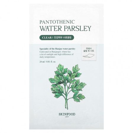 Описание ОчиститьФирменное блюдо из водной петрушки ханджэSkinfood 1957Протестировано дерматологами для чувствительной кожи Культивируется в Ханджаэголе, где много солнечного света и большие перепады суточных температур.Мягкая тканевая маска с увлажняющей охлаждающей формулой мгновенно успокаивает уставшую кожу. Рекомендации по применению 1. После очищения используйте тоник, чтобы очистить и разгладить кожу. 2. Нанесите маску на все лицо. 3. Примерно через 20–30 минут снимите маску и слегка похлопайте, чтобы оставшаяся эссенция впиталась в кожу. Ингредиенты Вода, экстракт японской петрушки (Oenanthe javanica), пропандиол. глицерет-26, дипропиленгликоль. 1,2-гександиол, экстракт ламинарии японской (Laminaria japonica), экстракт листьев эклипты простертой (Eclipta prostrata), масло из цветков герани (Pelargonium graveolens), гидрогенизированный лецитин, масло шалфея (Salvia officinalis), масло пачули (Pogostemon cablin), масло бергамота (Citrus aurantium bergamia), октилдодецет-16, карбомер, трометамин, пантенол, ксантановая камедь. двунатриевая эдта, метилдиизопропилпропионамид. фруктоолигосахариды, бета-глюкан, гидролизованная гиалуроновая кислота, никотинамид, линоленовая кислота, биотин, цианокобаламин, аскорбиновая кислота, токоферилацетат, пантотеновая кислота, гидроксиацетофенон, цитронеллола. Предупреждения Только для наружного применения. Избегать попадания в глаза. Хранить в недоступном для детей месте. Прекратите использование при появлении признаков раздражения.