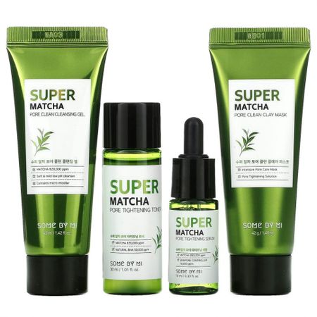 Уход за порамиОчищение порУвлажнениеКонтроль за выработкой кожного салаСодержитSome By Mi, очищающий гель Super Matcha, 42 мл (1,42 жидк. унции)Some By Mi, очищающая бьюти-маска из глины Super Matcha, 42 г (1,48 унции)Some By Mi, тонер для сужения пор Super Matcha, 30 мл (1,01 жидк. унции)Some By Mi, сыворотка для сужения пор Super Matcha, 10 мл (0,33 жидк. унции)Философия Some By MiКонцепция Some By Mi: заметные изменения кожи благодаря натуральным ингредиентам.Не содержат 20 нежелательных ингредиентовПродукты проходят дерматологическое тестированиеСодержат натуральные экстракты