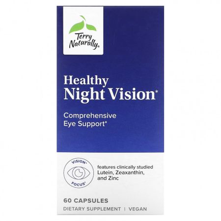 Описание Комплексная поддержка глазВидение, концентрацияСодержит клинически изученные лютеин, зеаксантин и цинкПищевая добавкаВеганский продуктБез ГМОЛабораторные испытания на чистоту и качествоСовершенно превосходная формулаВаши глаза много работают в течение дня. Но ночью их нагрузка увеличивается вдвое. Первоклассные питательные вещества в этой уникальной формуле обеспечивают максимальную поддержку. Лютеин и зеаксантин поддерживают плотность макулярного пигмента, защищая глаза от негативного воздействия синего света.Цинк в биодоступной форме вместе с витамином А поддерживает зрение в условиях низкой освещенности.Витамин А в форме ретинола поддерживает стержни в сетчатке, отвечающие за зрение в условиях низкой освещенности.Экстракт косточек французского винограда VX1® содержит 100% абсорбируемые олигомерные проантоцианидины (OPC), которые поддерживают тонкие кровеносные сосуды глаз и защищают их от риска окислительного стресса и случайного напряжения.Оцените широкий спектр преимуществ.Для поддержки зрения при слабом освещении и многого другогоЭта комплексная формула для поддержки глаз сочетает в себе мощные ингредиенты, которые работают синергетически, снижая периодическую усталость глаз, способствуя здоровому старению глаз и поддерживая общее здоровье зрения. Помогает защитить глаза от воздействия синего светаПоддерживает зрение и фокусировку в условиях низкой освещенностиЗащищает линзы от случайной деформацииПоддерживает здоровье макулы и кровеносных сосудов Рекомендации по применению 1 капсула два раза в день. Ингредиенты Микрокристаллическая целлюлоза, гидроксипропилметилцеллюлоза (капсулы из растительной целлюлозы), крахмала, лимонная кислота, стеариновая кислота растительного происхождения, стеарат магния растительного происхождения, глюкоза, диоксид кремния, аскорбат натрия, мальтодекстрин.Не содержит соли, дрожжей, пшеницы, глютена, соя, молочных продуктов, искусственных красителей, искусственных ароматизаторов, искусственных консервантов.Продукция бренда Terry Naturally содержит натуральные и другие ингредиенты премиального качества.Продукт производится на предприятии, имеющем регистрацию текущей надлежащей производственной практики (cGMP). Предупреждения Перед началом применения во время беременности или в период кормления грудью проконсультируйтесь с врачом. Пищевая ценностьРазмер порции: 1 капсулаПорций в упаковке: 60 Количество в 1 веганской капсуле:% от суточной нормыВитамин A (в виде ретинилацетата)1500 мкг (5000 МЕ) 167% Цинк (из хелата бисглицината цинка TRAACS ™)30 мг 273%Французский виноград